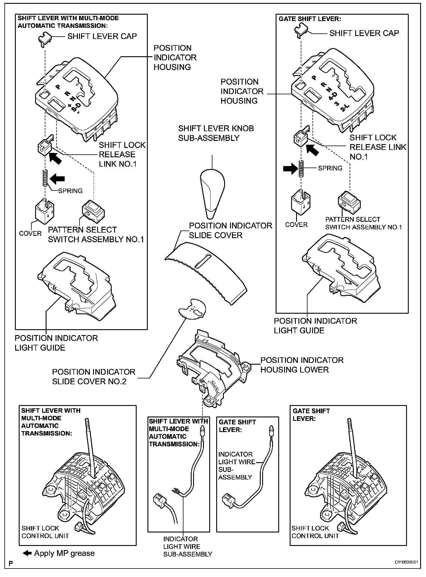 a. Apply MP grease to the shift lock release link and spring.