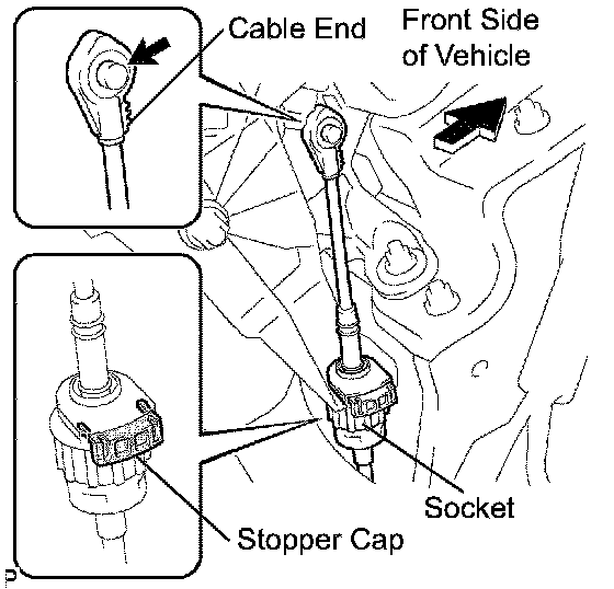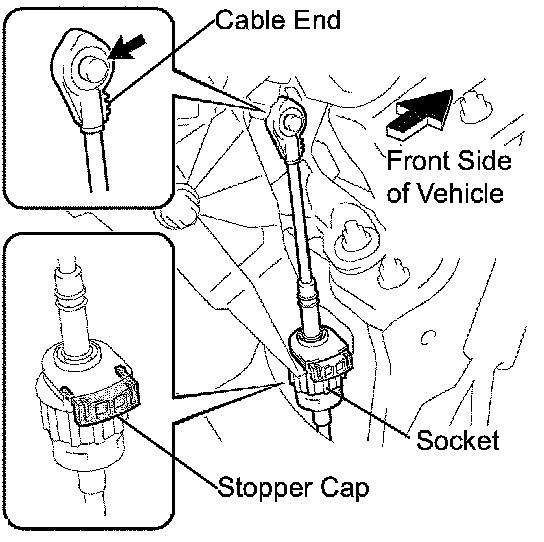b. Turn the socket of the transmission control cable assembly counterclockwise and remove the stopper cap.