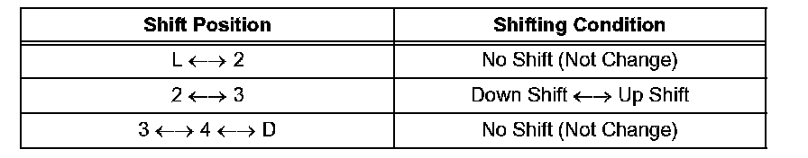 Shifting the shift lever in the order of 2, 3, 4 and D position to check whether the shifting condition changes the table.