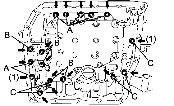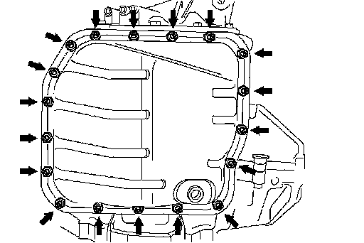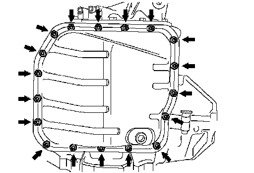 c. Install the oil pan and new gasket with the 18 bolts to the transaxle case.