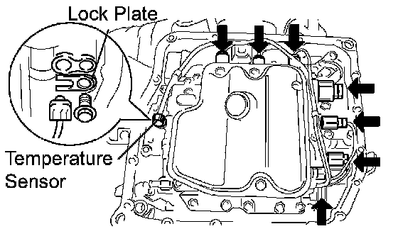 b. Remove the bolt and lock plate, and disconnect the ATF temperature sensor.