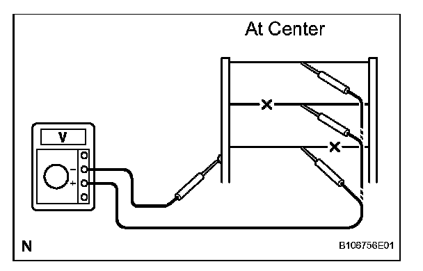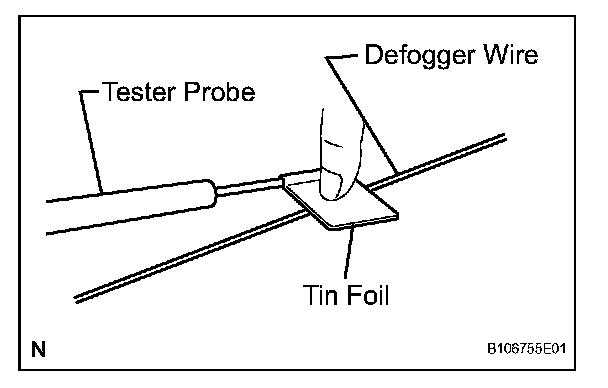 c. Check the voltage at the center of each defogger wire, as shown in the illustration.
