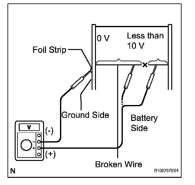 HINT: If the defogger wire is not broken, the voltmeter should indicate 0 V at the positive (+) end of the defogger wire but gradually increases to approximately 12 V as the meter probe moves to the other end.