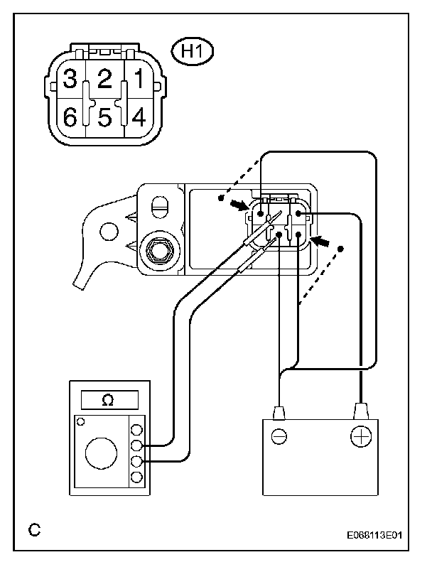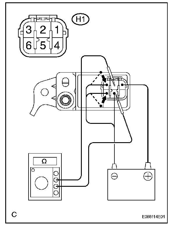 5. Connect the negative (-) lead of the battery to the terminal 3 and the terminal 6, and check that continuity exists between the terminal 2 and the terminal 5 for 0.8 to 0.9 seconds, then no continuity exists.