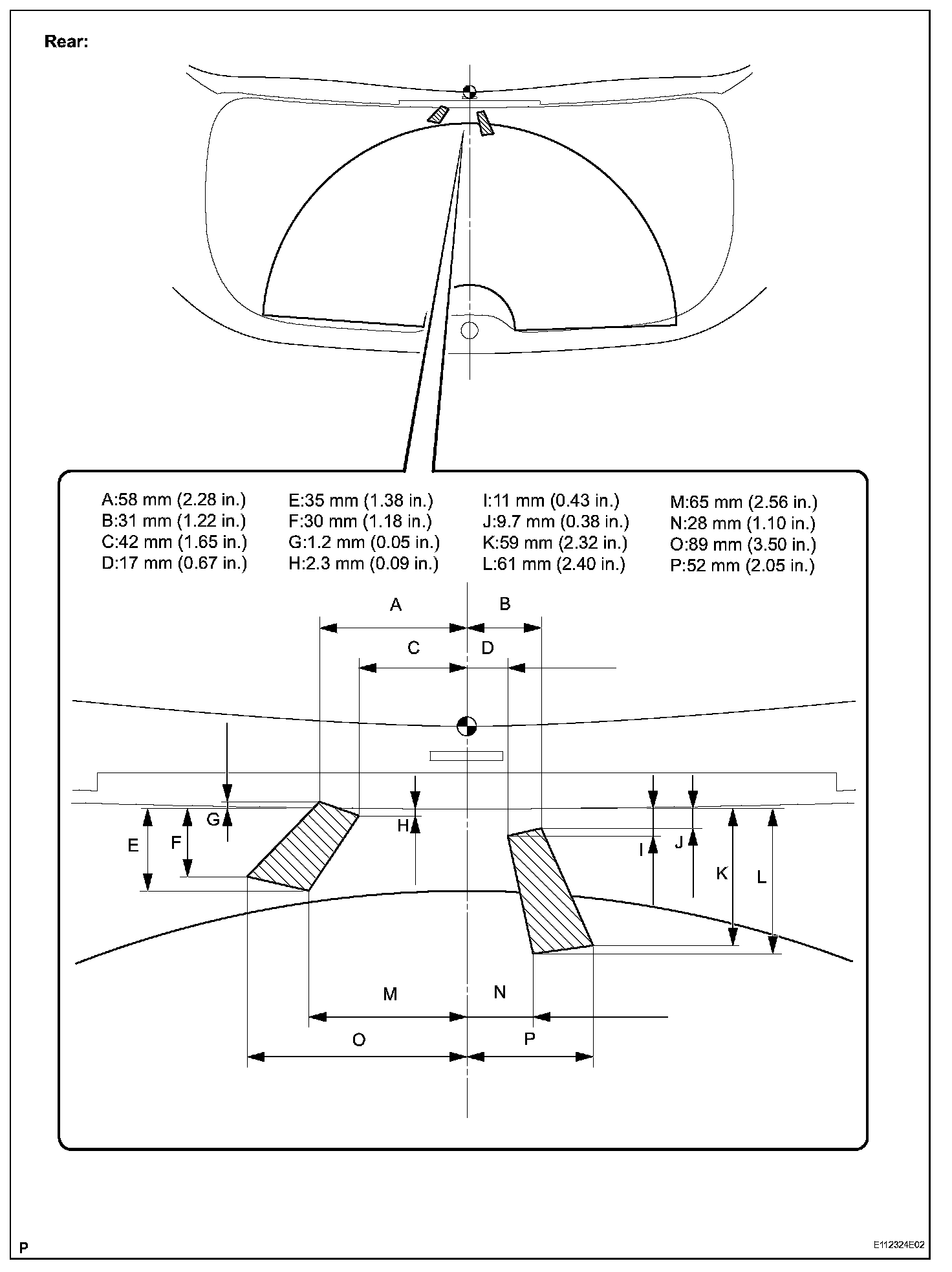 Standard: Washer fluid hits the back door glass in the areas shown in the illustration.