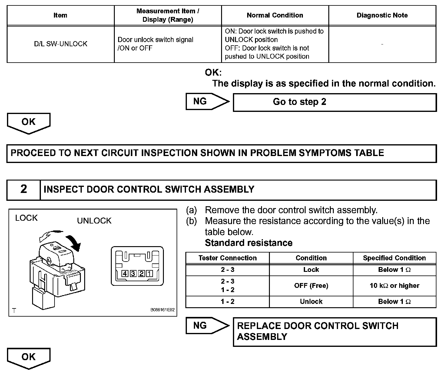 When the lock side of the door control switch is pressed, continuity is established between terminals 3 and 2 of the switch. When the unlock side of the switch is pressed, continuity is established between terminals 1 and 2.