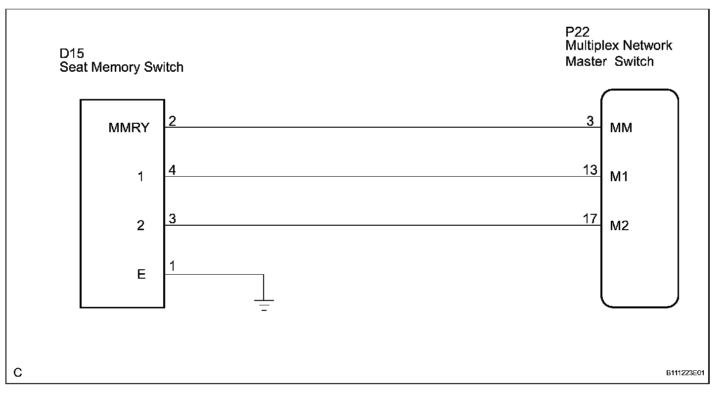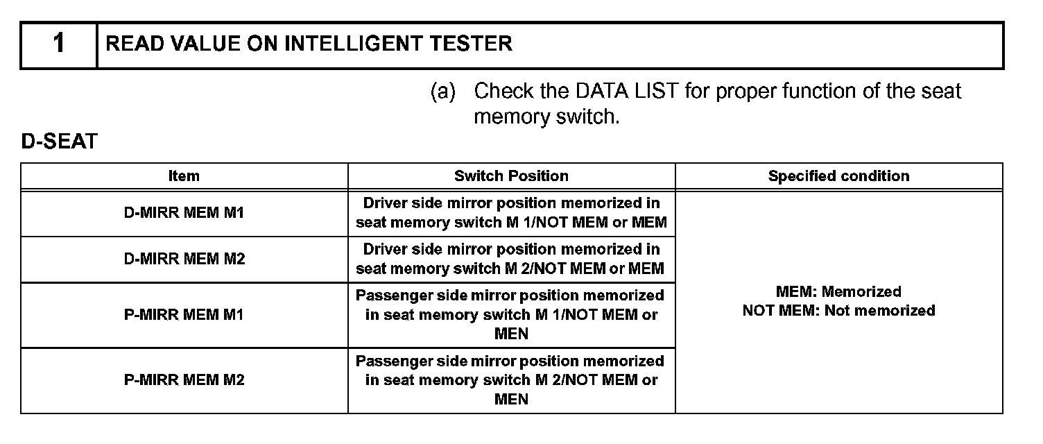 When the seat memory switch M1 or M2 is pressed, the position control ECU & switch (Seat ECU) transmits a signal of the memorized mirror position to the outer mirror control ECU by way of the power window regulator master switch. Then, the outer mirror control ECU drives the mirror motor.