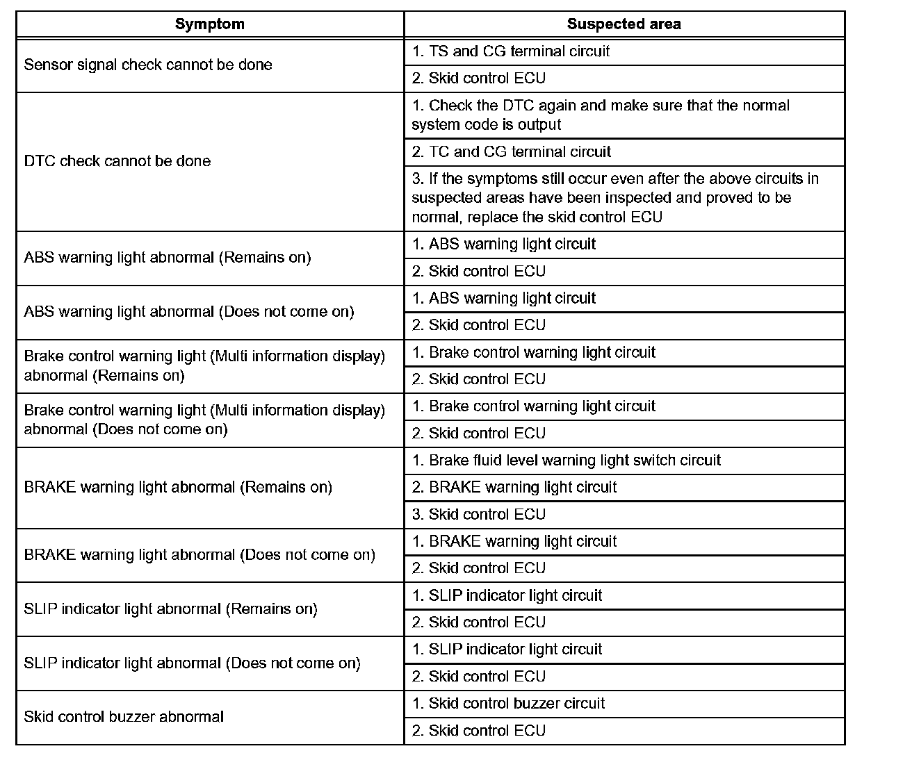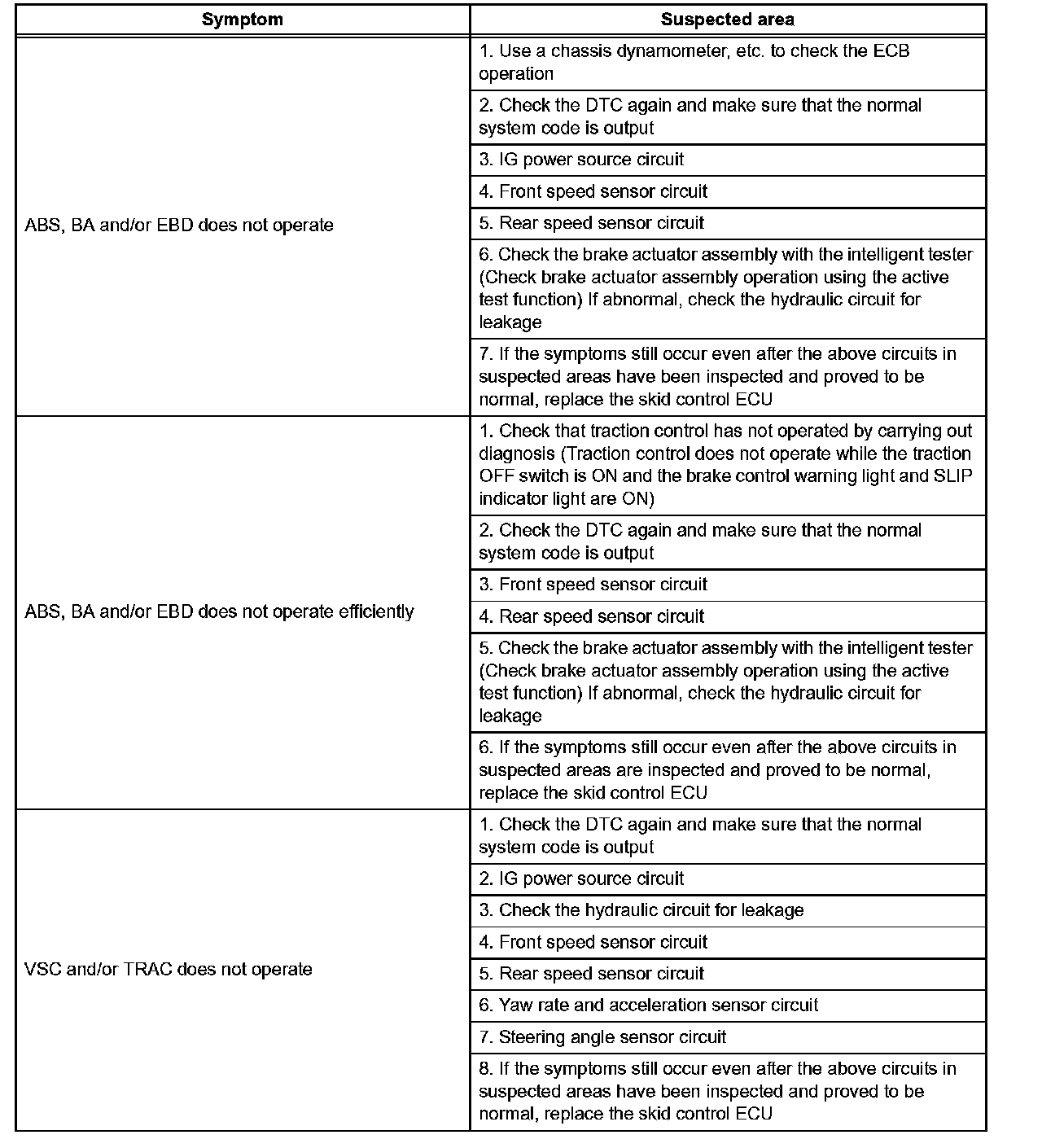PROBLEM SYMPTOMS TABLEIf there are no DTCs output but the problem still occurs, check the circuits for each problem symptom in the order given in the table and proceed to the relevant troubleshooting.