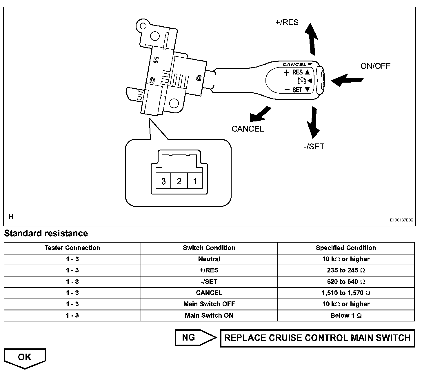 The cruise control main switch operates 7 functions: SET, COAST, TAP-DOWN, RESUME, ACCEL, TAP-UP, and CANCEL. The SET, TAP-DOWN and COAST functions, and the RESUME, TAP-UP and ACCEL functions are operated with the same switch. The cruise control main switch is an automatic return type switch which turns on only while operating it in each arrow direction and turns off after releasing it. The internal contact point of the cruise control main switch is turned on with the switch operation. Then the ECM reads the resistance value that has been changed by the switch operation to control SET, COAST, RESUME, ACCEL and CANCEL.