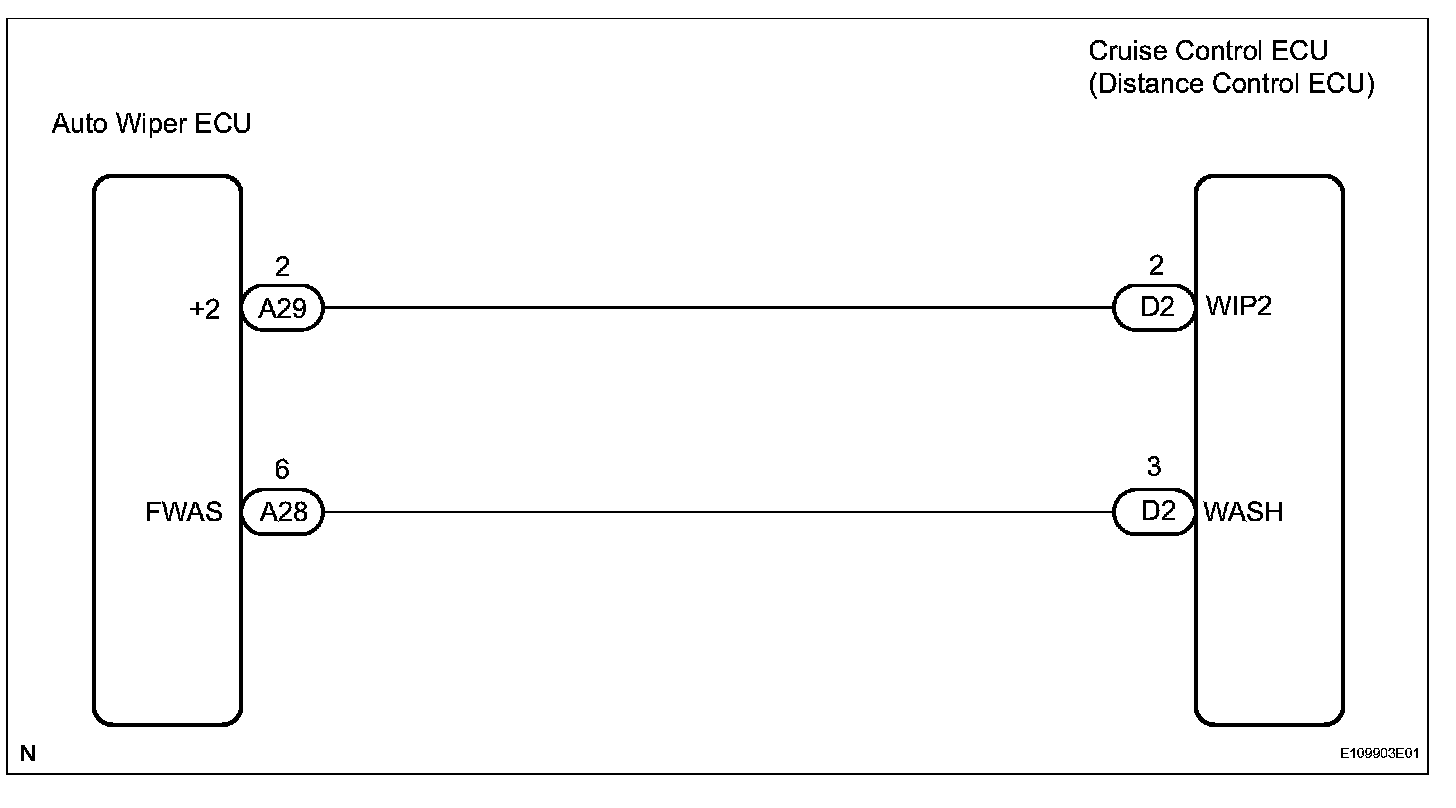 HINT: A wiper switch signal is sent to the distance control ECU via the CAN and BEAN. If there are any malfunctions in this circuit, check for DTCs in the CAN communication and multiplex communication systems. When the wiper is in the HI mode, the dynamic radar cruise control is automatically canceled and goes into the standby mode.
