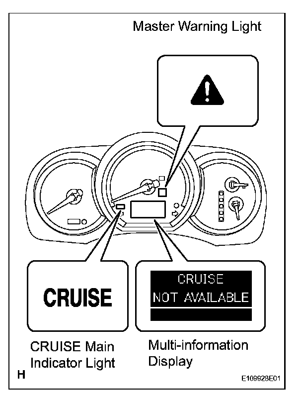 b. The CRUISE main indicator light blinks, the master warning light comes on with the warning sound "Pop", and the display shows "CRUISE NOT AVAILABLE". The cruise control operation is suspended until the canceling condition is resolved (in the vehicle-to-vehicle distance control mode only). The auto cancel function cancels the cruise control operation in the following condition.