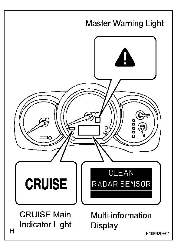c. The auto cancel function cancels the cruise control operation in the following conditions. At this time, the CRUISE main indicator light blinks, the master warning light comes on with the warning sound "Pop" and the display shows "CLEAN RADAR SENSOR". The cruise control operation is suspended until the canceling condition is resolved (in the vehicle-to-vehicle distance control mode only).