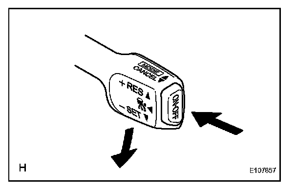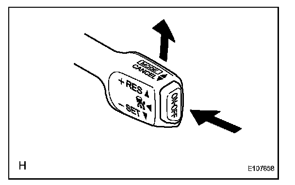 4. Check that vehicle speed increases while the cruise control main switch is pushed to +/RES, and that the vehicle cruises at the newly set speed when the switch is released.