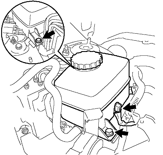 b. Remove the nut, 2 bolts and reservoir bracket.