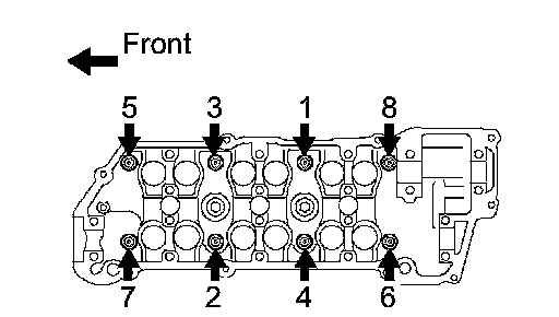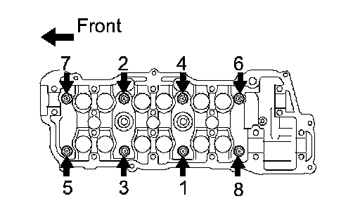 c. Using several steps, install and tighten the 8 cylinder head bolts uniformly in the sequence shown in the illustration.