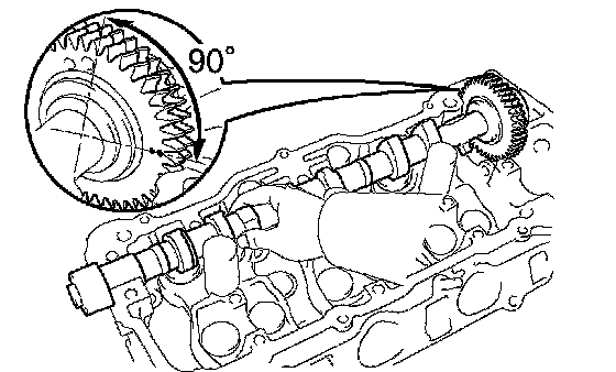 b. Place the No. 2 camshaft at a 90° angle of the timing mark (2-dot mark) on the cylinder head.