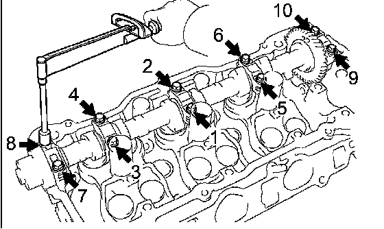 f. Using several steps, tighten the 10 bearing cap bolts uniformly in the sequence shown in the illustration.
