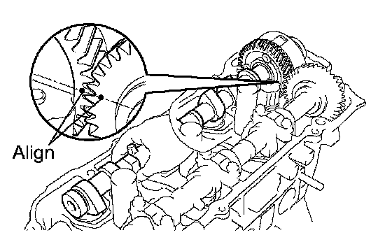 b. Align the timing marks (1 -dot mark) of the camshaft drive gear with the mark on the driven gear.