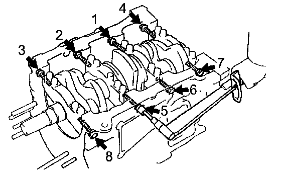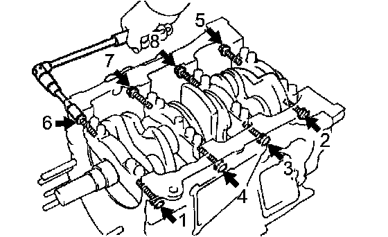 a. Using several steps, loosen and remove the 8 main bearing cap bolts and seal washers uniformly in the sequence shown in the illustration.