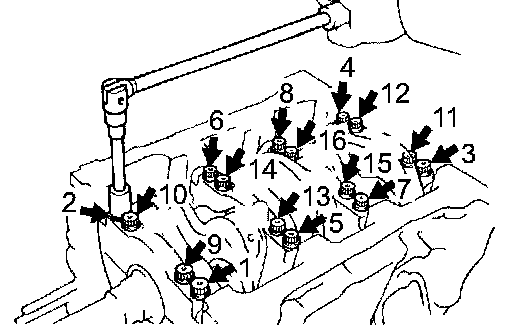 b. Using several steps, loosen and remove the 16 main bearing cap bolts uniformly in the sequence shown in the illustration.