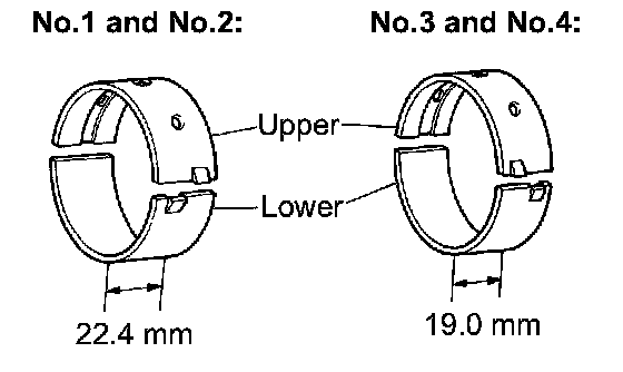 HINT: Main bearings come in widths of 22.4 mm (0.882 inch) and 19.0 mm (0.748 inch). Install the 22.4 mm (0.882 inch) bearings in the No. 1 and No. 2 cylinder block journal positions with the main bearing cap. Install the 19.0 mm (0.748 inch) bearings in the No. 3 and No. 4 positions.