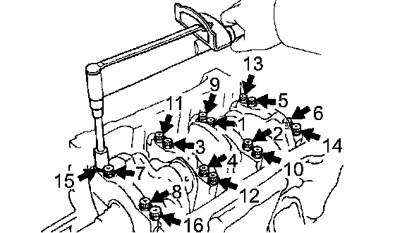 l. Using several steps, install and tighten the 16 main bearing cap bolts uniformly in the sequence shown in the illustration.