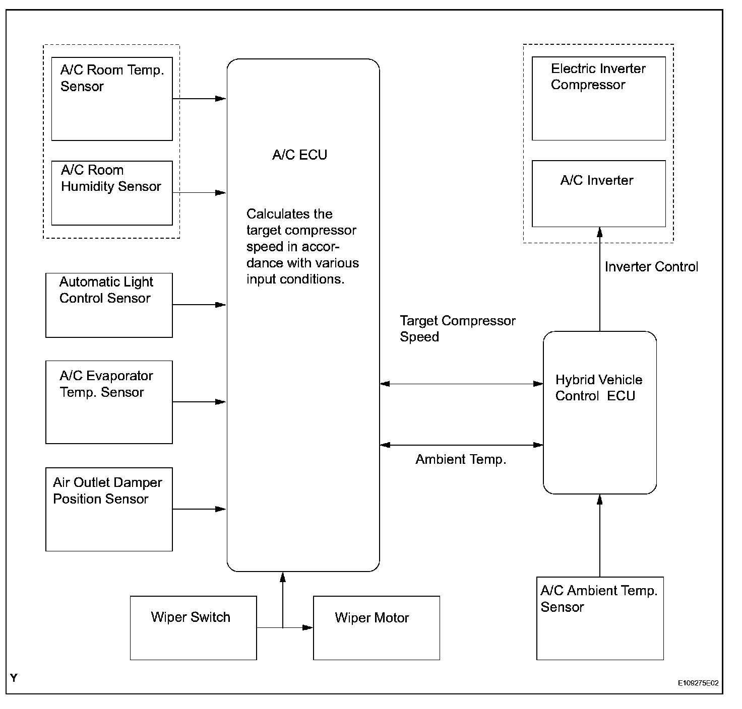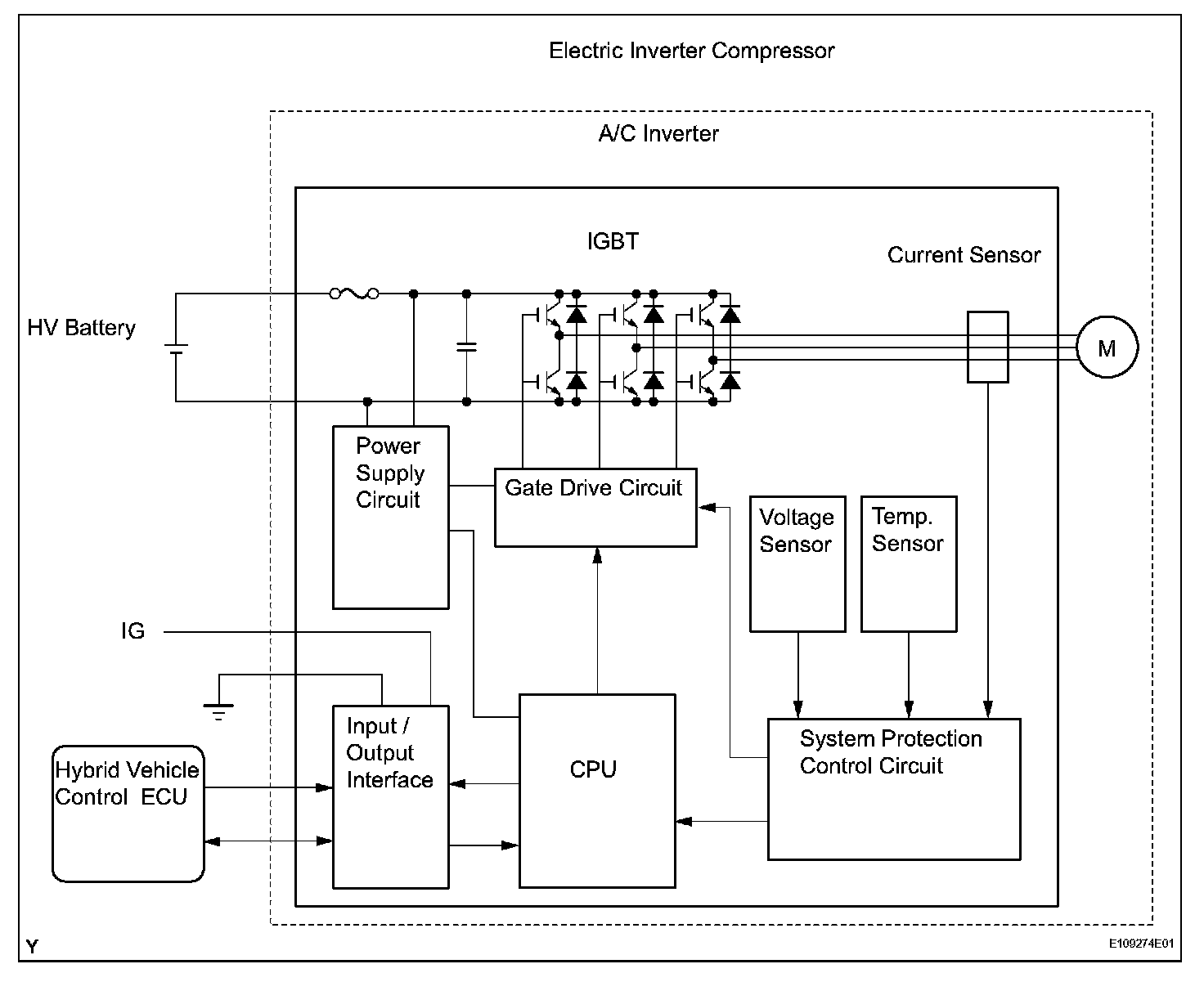 - The compressor uses high-voltage alternating current. If a short or open circuit occurs in the compressor wiring harness, the hybrid vehicle control ECU will cut off A/C inverter circuit in order to stop the power supply to the compressor.