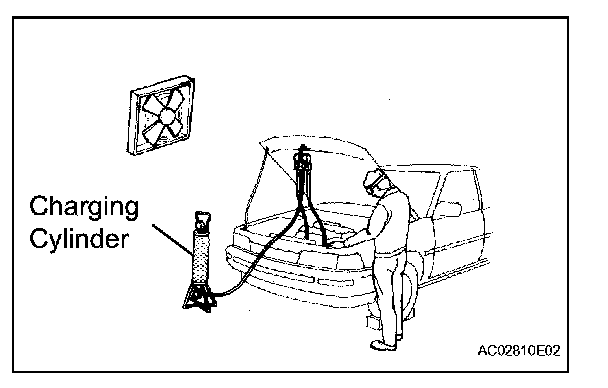 Open and close only the low pressure valve. If the high pressure values are opened, refrigerant flows in the reverse direction causing the charging cylinder to rupture.