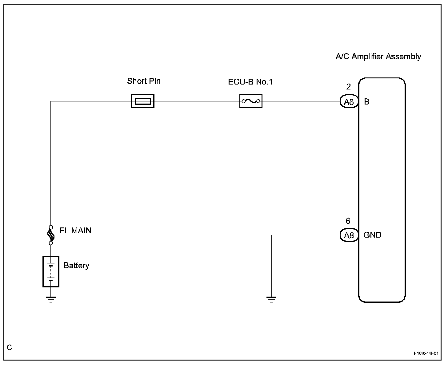 This is the back-up power source circuit for the A/C amplifier assembly. Power is supplied even when turning the ignition switch off and is used for diagnostic trouble code memory, etc.