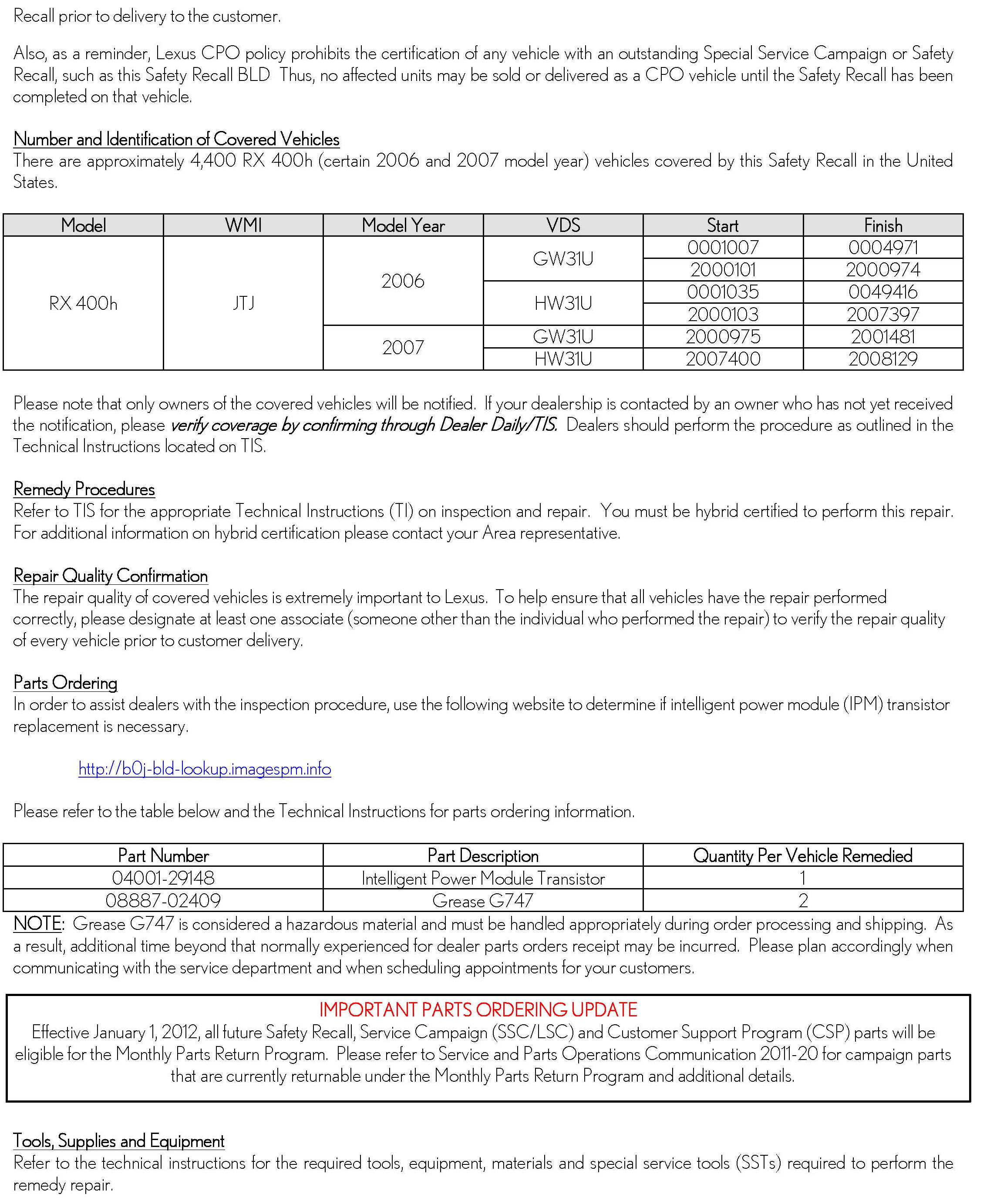 Recall - Hybrid Intelligent Power Module (IPM) Replacement