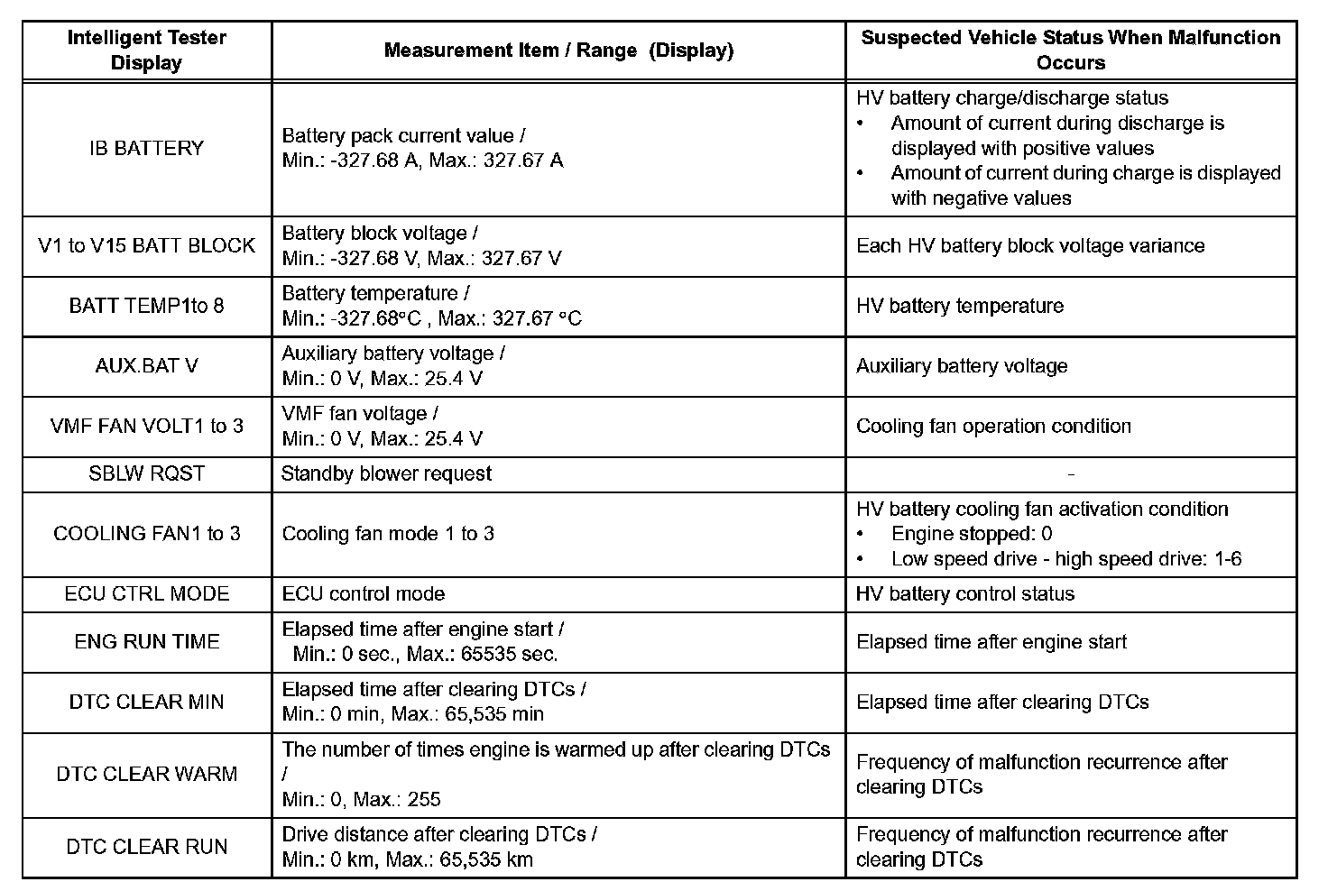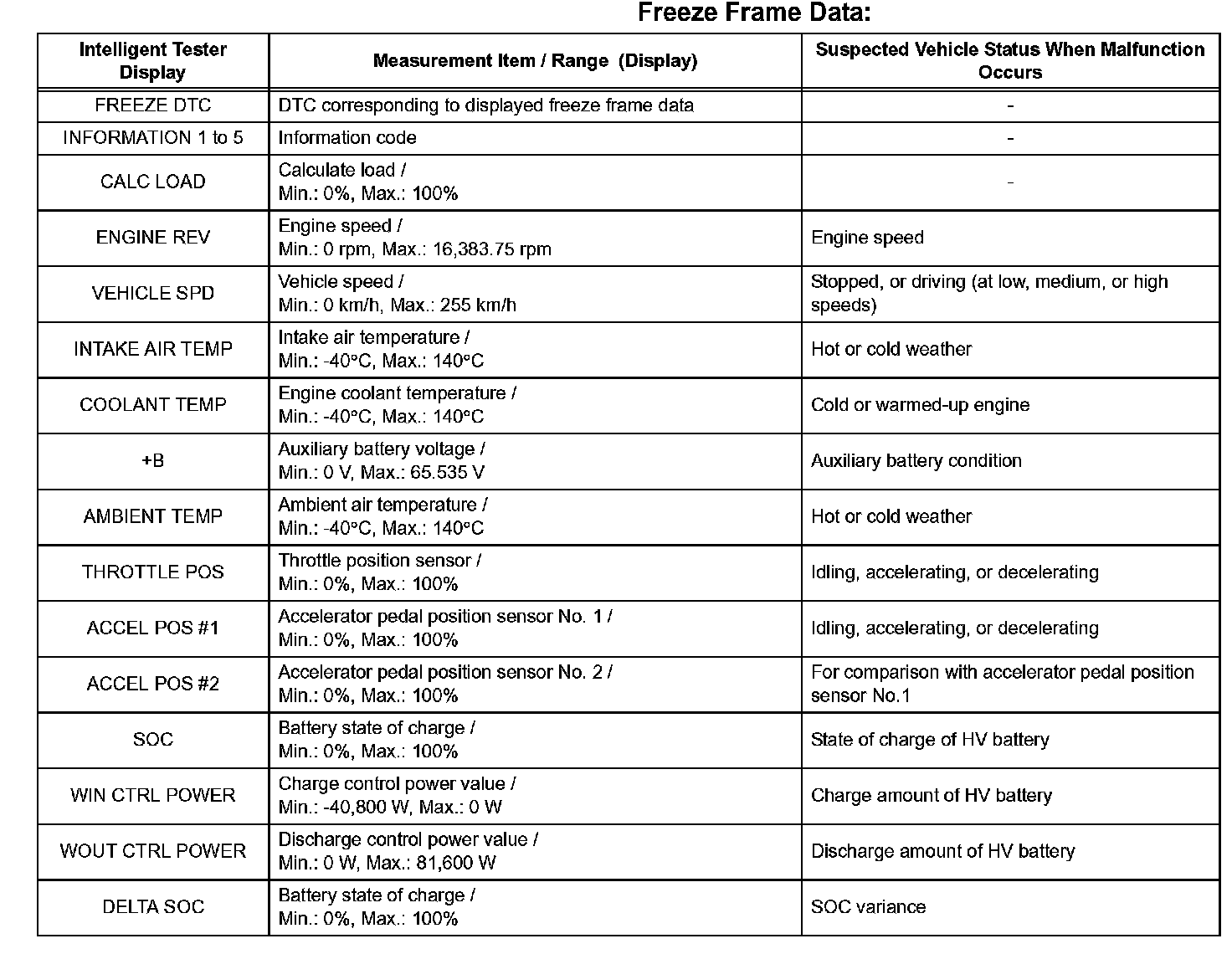 FREEZE FRAME DATAHINT: The HV control ECU records vehicle and driving condition information as freeze frame data the moment a DTC is stored. It is used for estimating or simulating the vehicle conditions when the malfunction occurred. To confirm the details of the hybrid control system, check the detailed information for the DTC (Information).