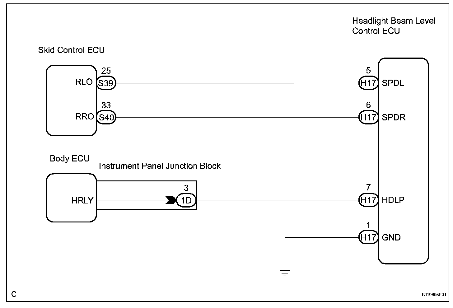 Headlight beam level control ECU receives the vehicle speed signal from the skid control ECU.