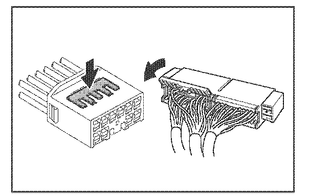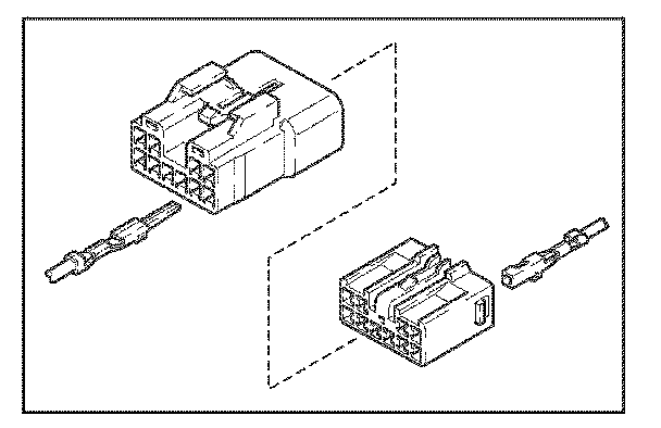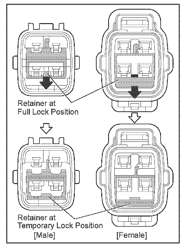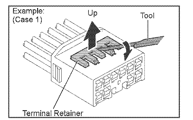Insert the special tool into the terminal retainer access hole (/\Mark) and pull the terminal retainer up to the temporary lock position.