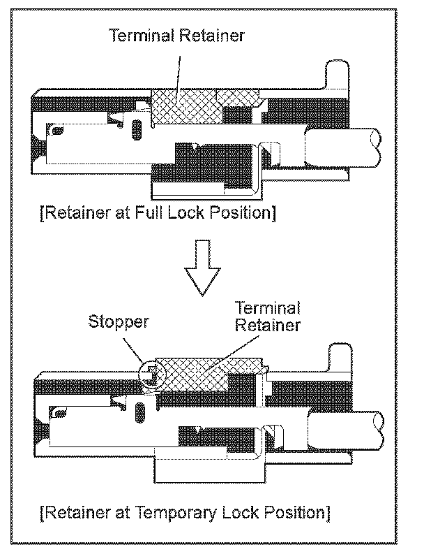 3. Insert the terminal with terminal retainer in the temporary lock position.