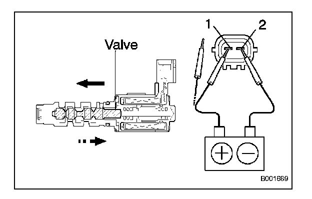 1. Connect the positive (+) lead from the battery to terminal 1 and negative (-) lead to terminal 2, and check the movement of the valve.