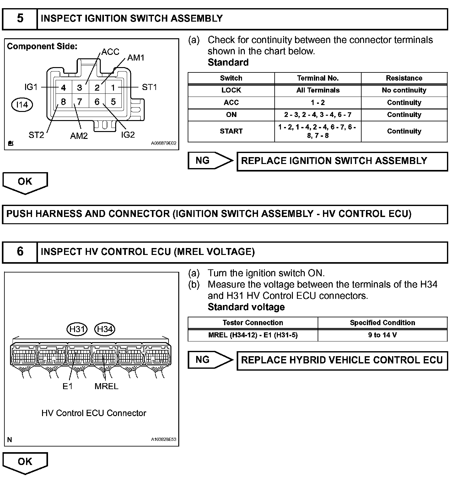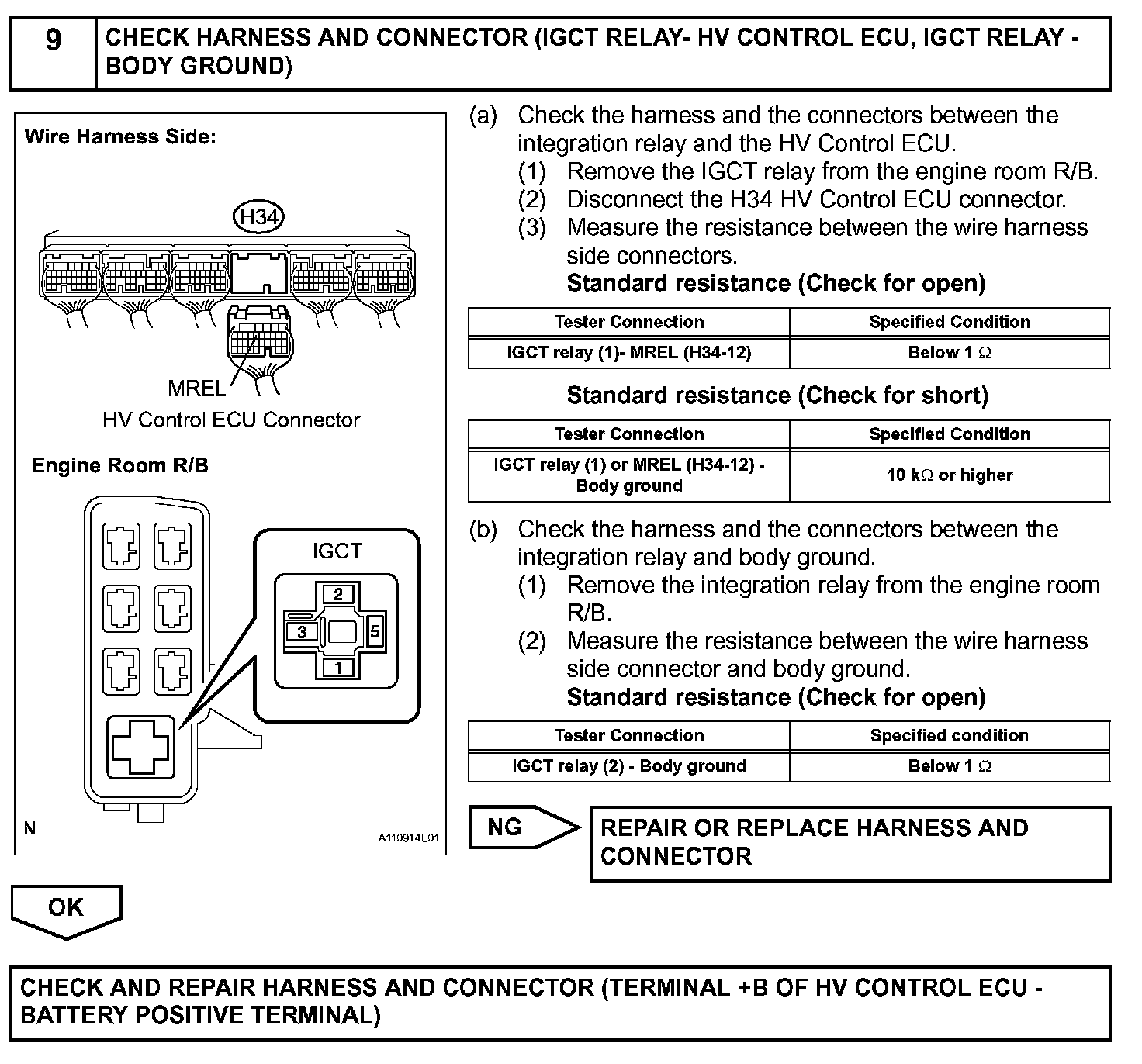 When the engine switch is turned to on, the battery voltage is applied to terminal IGSW of the ECM (Included in HV Control ECU). The ECM MREL output signal causes a current to flow to the coil, closing the contacts of the IGCT relay and supplying power to terminal +B of the ECM.