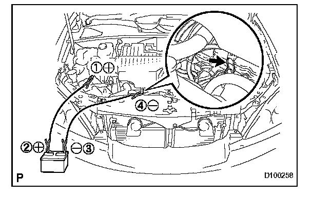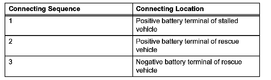4. Using a booster cable, connect the 12 V battery of the rescue vehicle and the auxiliary battery of the stalled vehicle, as shown in the illustration.