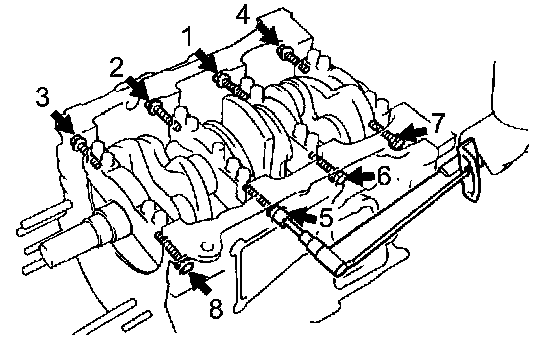 8 Main Bearing Cap Bolts w/New Seal Washers 27 Nm (275 kgf-cm, 20 ft. lbs.)