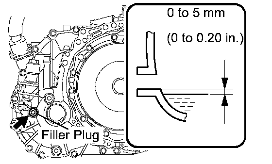 b. Check that the oil surface is within 5 mm (0.20 inch) from the lowest position of the inner surface of the differential filler plug opening.