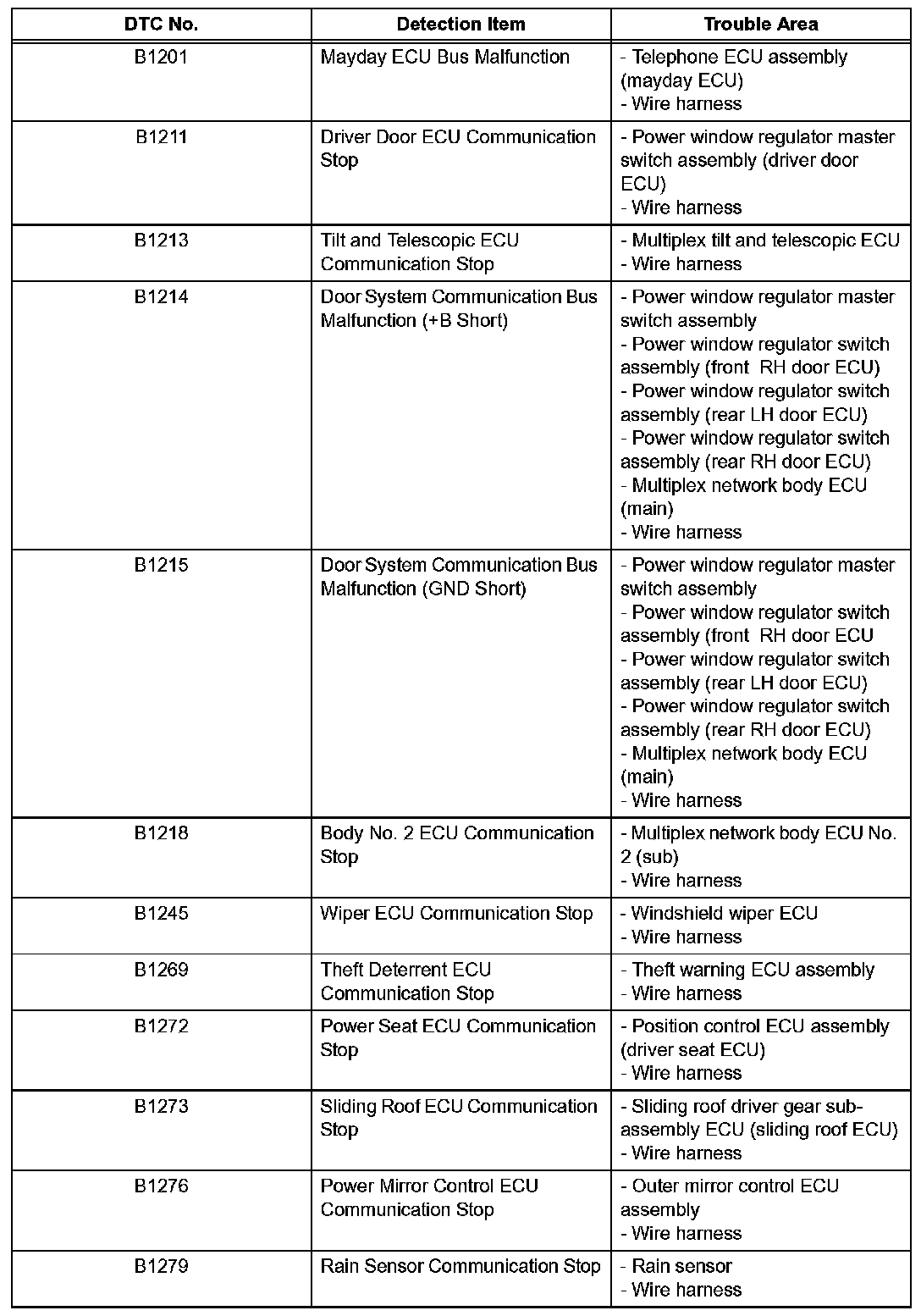 HINT: When DTC of "+B or GND short malfunction of communication bus (such as B1214, B1215, etc..)" and "communication stop (such as B1211, B1212, etc..)" are detected simultaneously, repair DTC of "+B or GND short malfunction of communication bus" first.