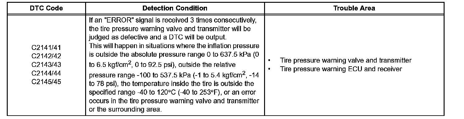 The tire pressure warning valve and transmitters that are installed in the tire and wheel assemblies measure the air pressure of the tires. The measured values are transmitted to the tire pressure warning antenna on the body as radio waves and then sent to the tire pressure warning ECU and receiver. The ECU compares the measured air pressure values with the air pressure threshold. When the measured air pressure value is less than this threshold, the warning light in the combination meter comes on. When the internal circuit of a tire pressure warning valve and transmitter is malfunctioning, one of these DTCs are output.