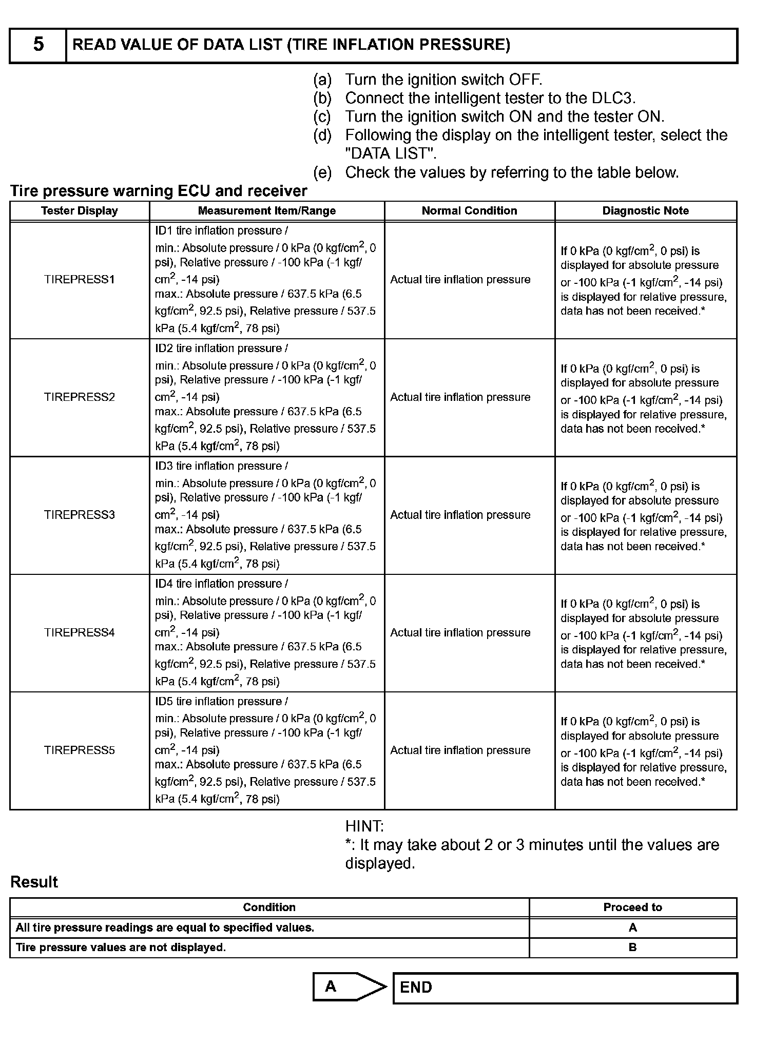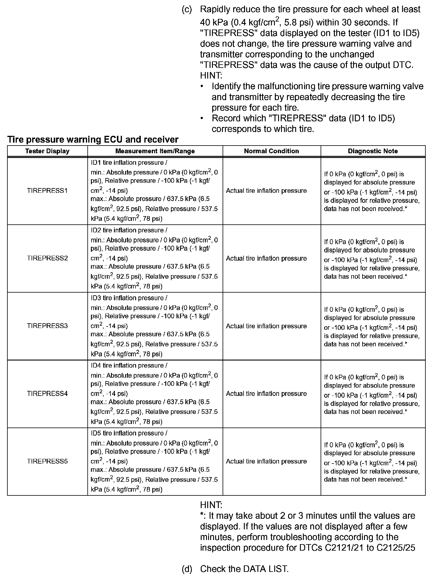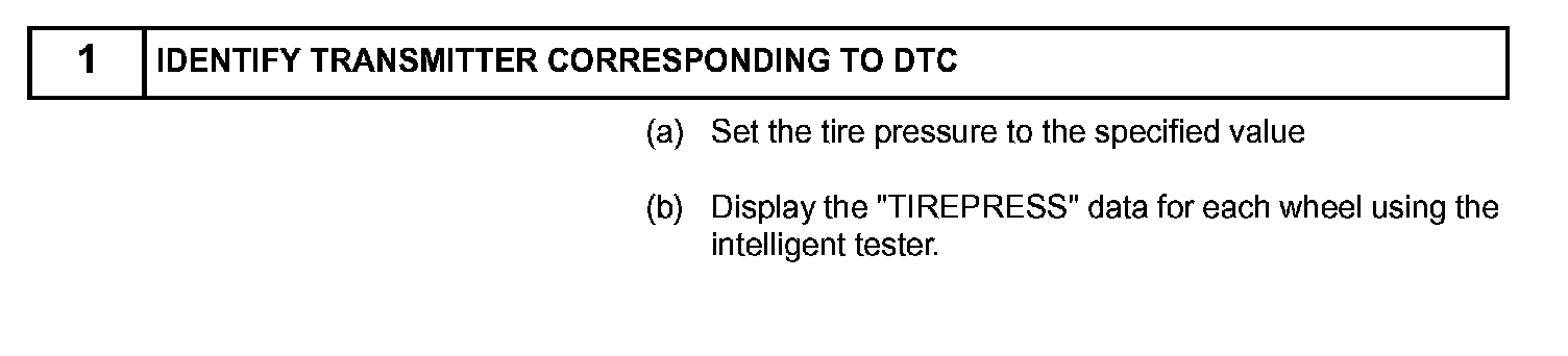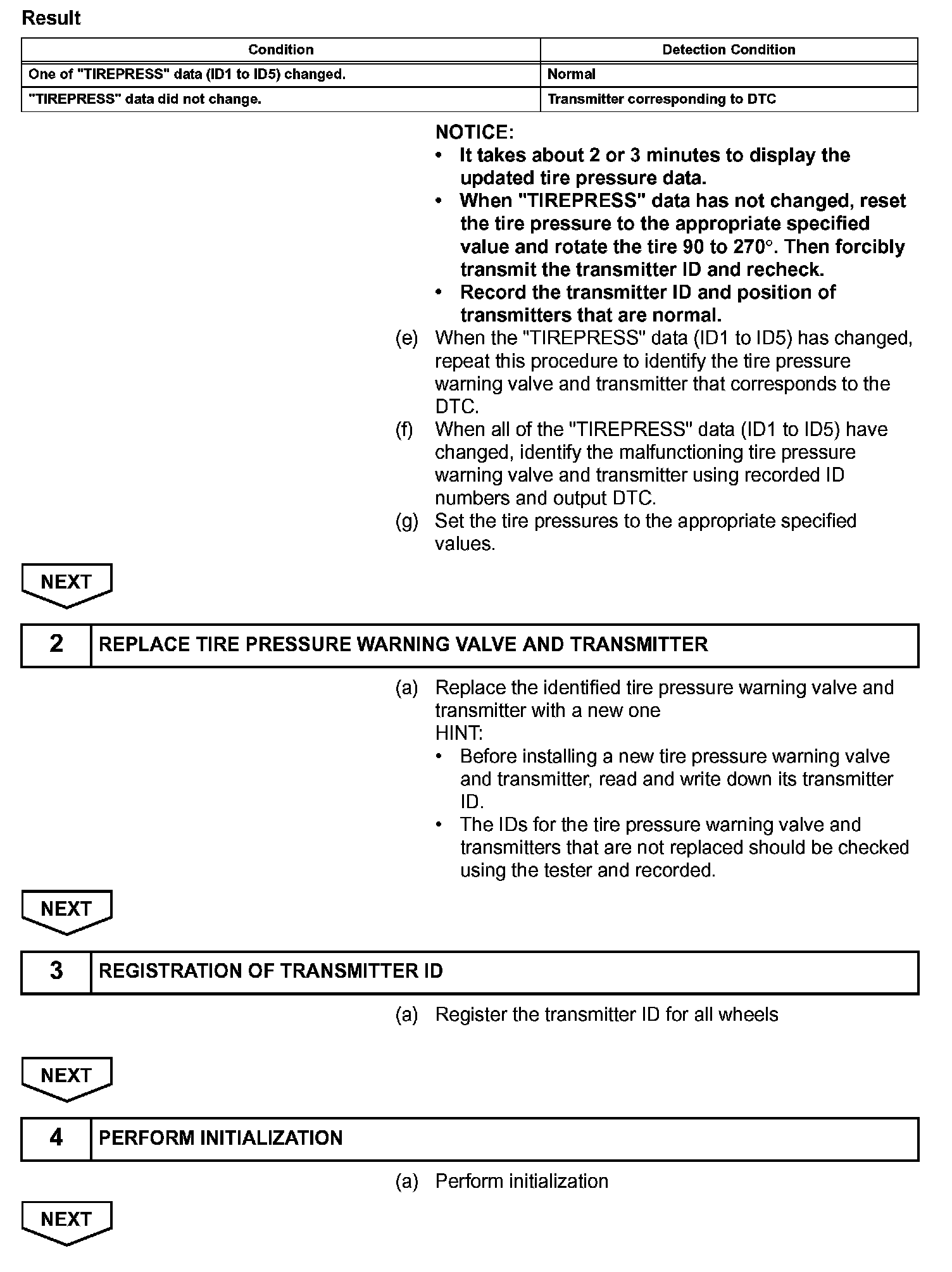HINT: It is necessary to perform the procedure to identify the tire pressure warning valve and transmitter that is malfunctioning because it cannot be identified by the output DTC.