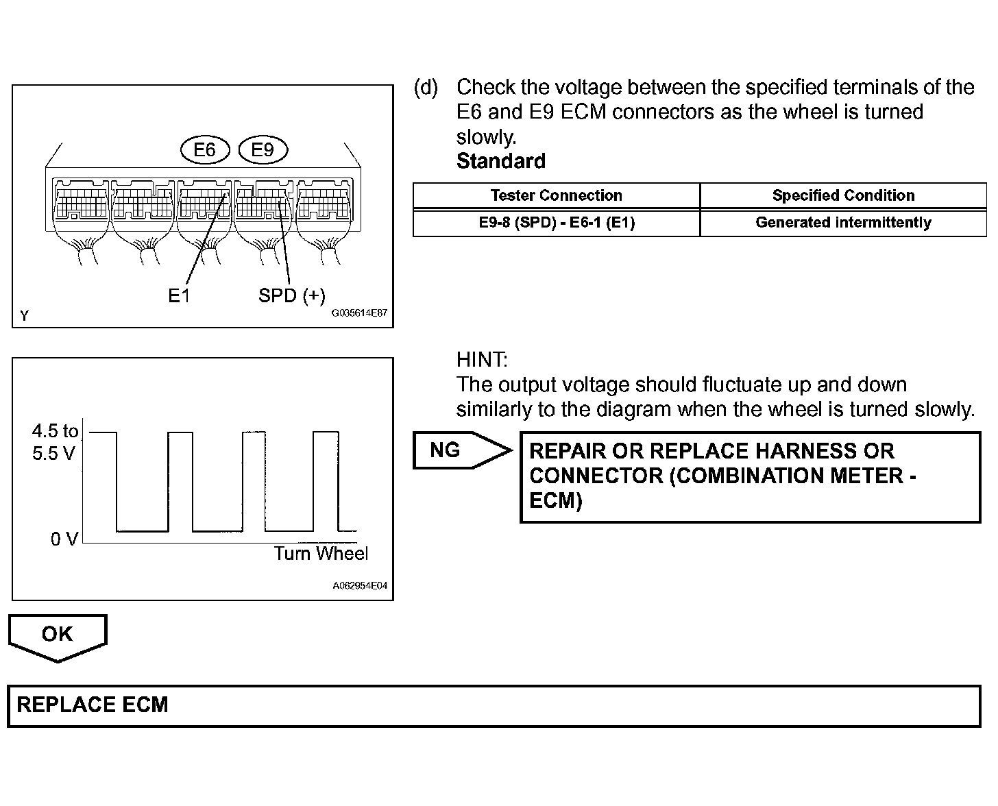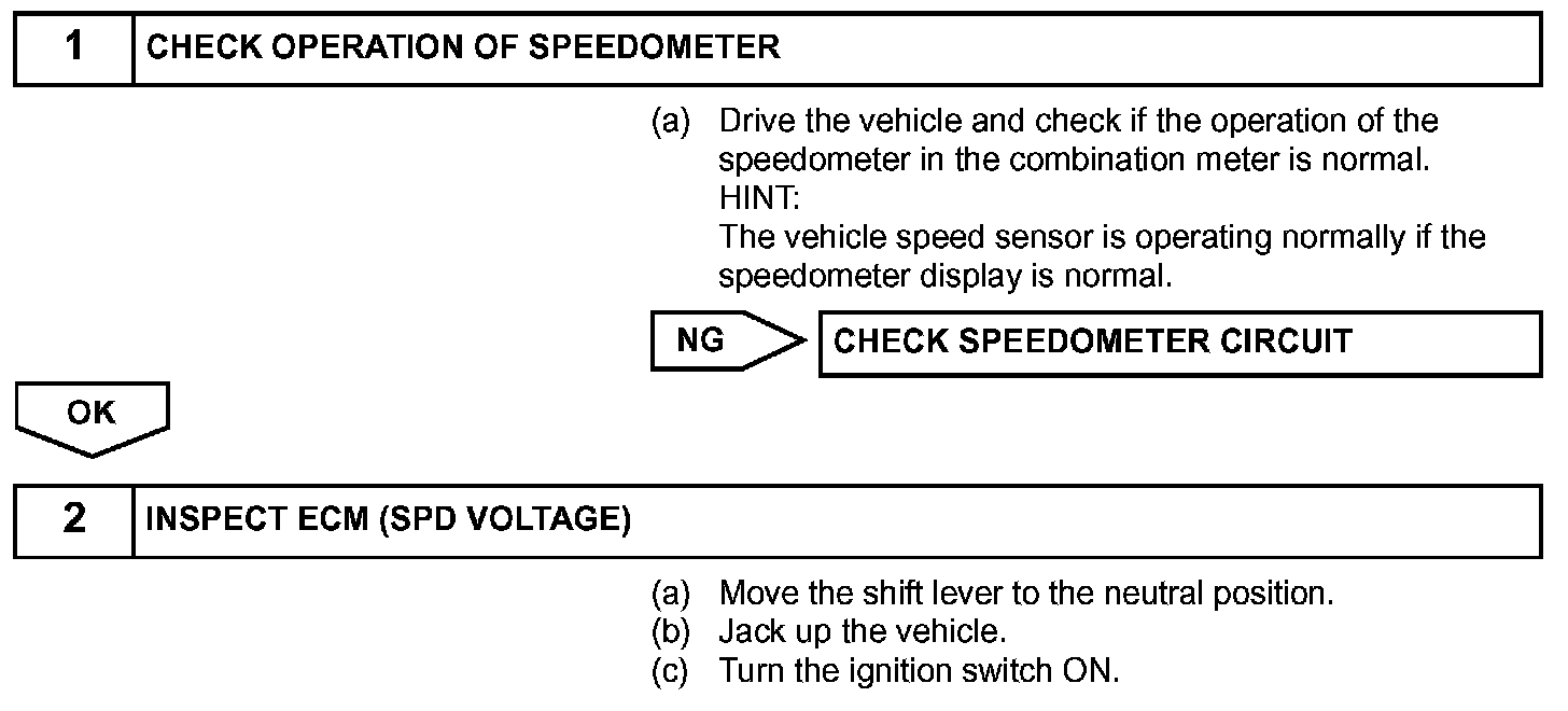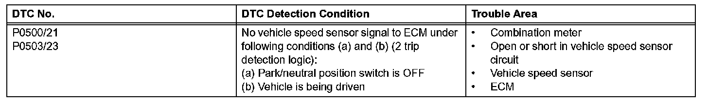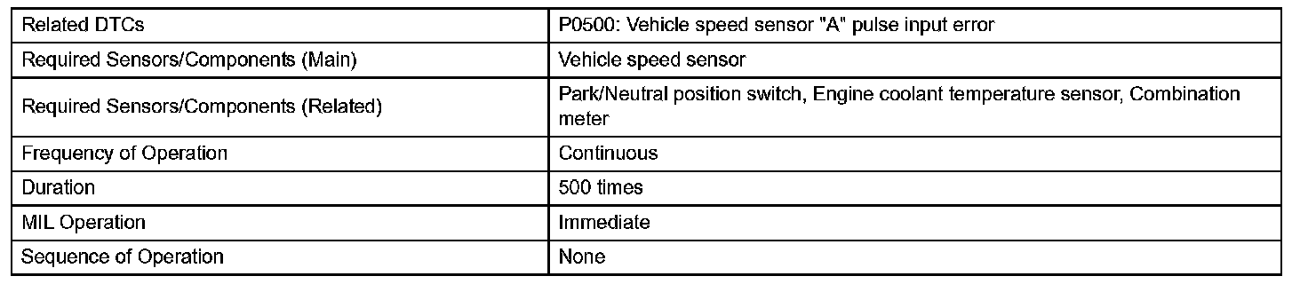 If there is no signal from the vehicle speed sensor when these conditions are satisfied, the ECM concludes that there is a fault in the vehicle speed sensor. The ECM will turn on the MIL and a DTC is set.