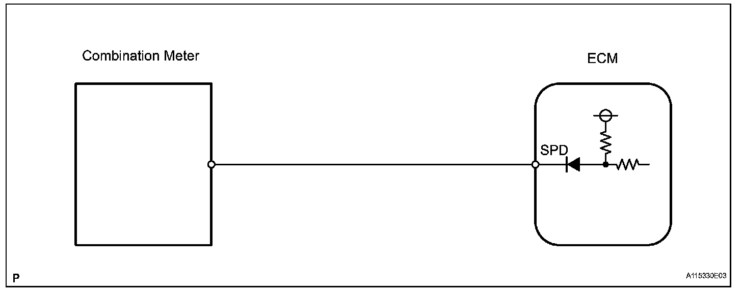 The speed sensor detects the wheel speed and sends the appropriate signals to the skid control ECU. The skid control ECU converts these wheel speed signals into a 4-pulse signal and outputs it to the ECM via the combination meter. The ECM determines the vehicle speed based on the frequency of these pulse signals.