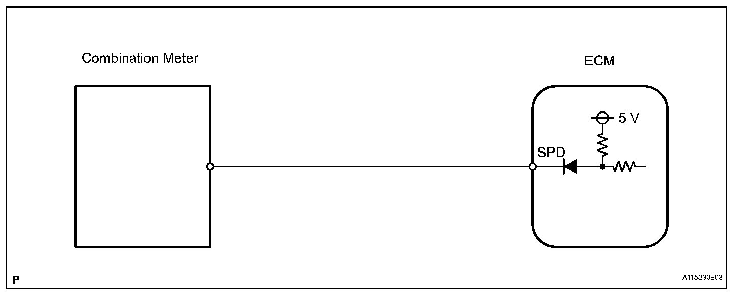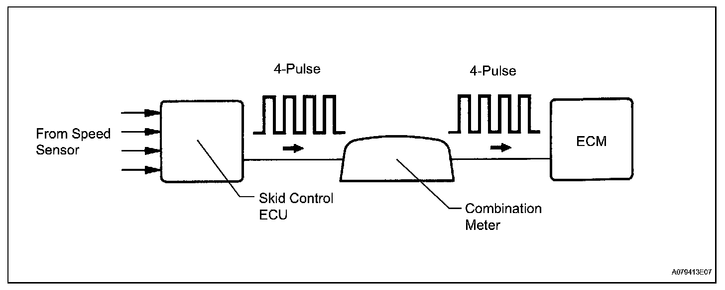 The speed sensor detects the wheel speed and sends the appropriate signals to the skid control ECU. The skid control ECU converts these wheel speed signals into a 4-pulse signal and outputs it to the ECM via the combination meter. The ECM determines the vehicle speed based on the frequency of these pulse signals.
