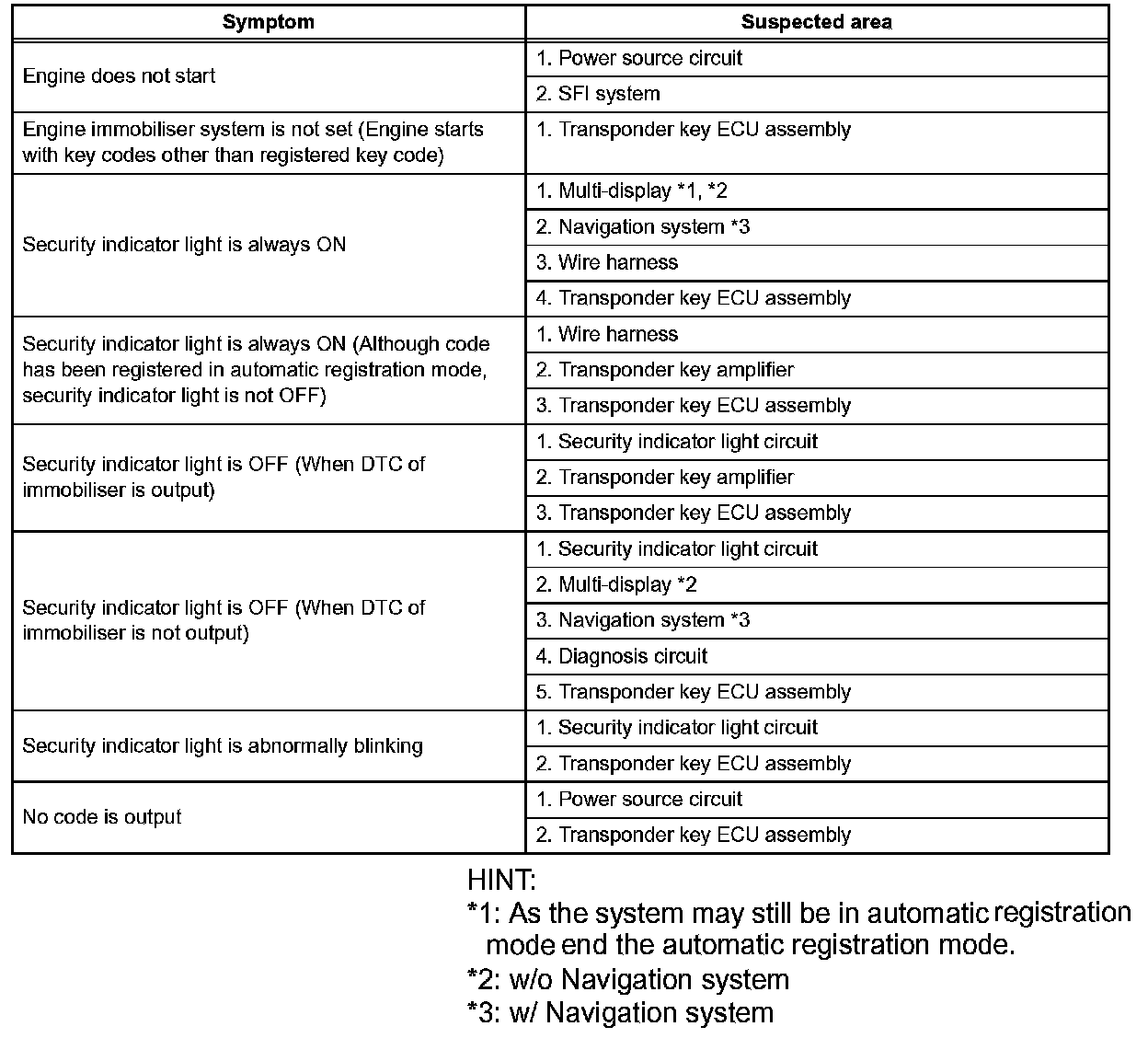 HINT: Use the table to help determine the cause of the problem symptom. The potential causes of the symptoms are listed in order of probability in the "Suspected Area" column of the table. Check each symptom by checking the suspected area in the order they are listed. Replace parts as necessary.