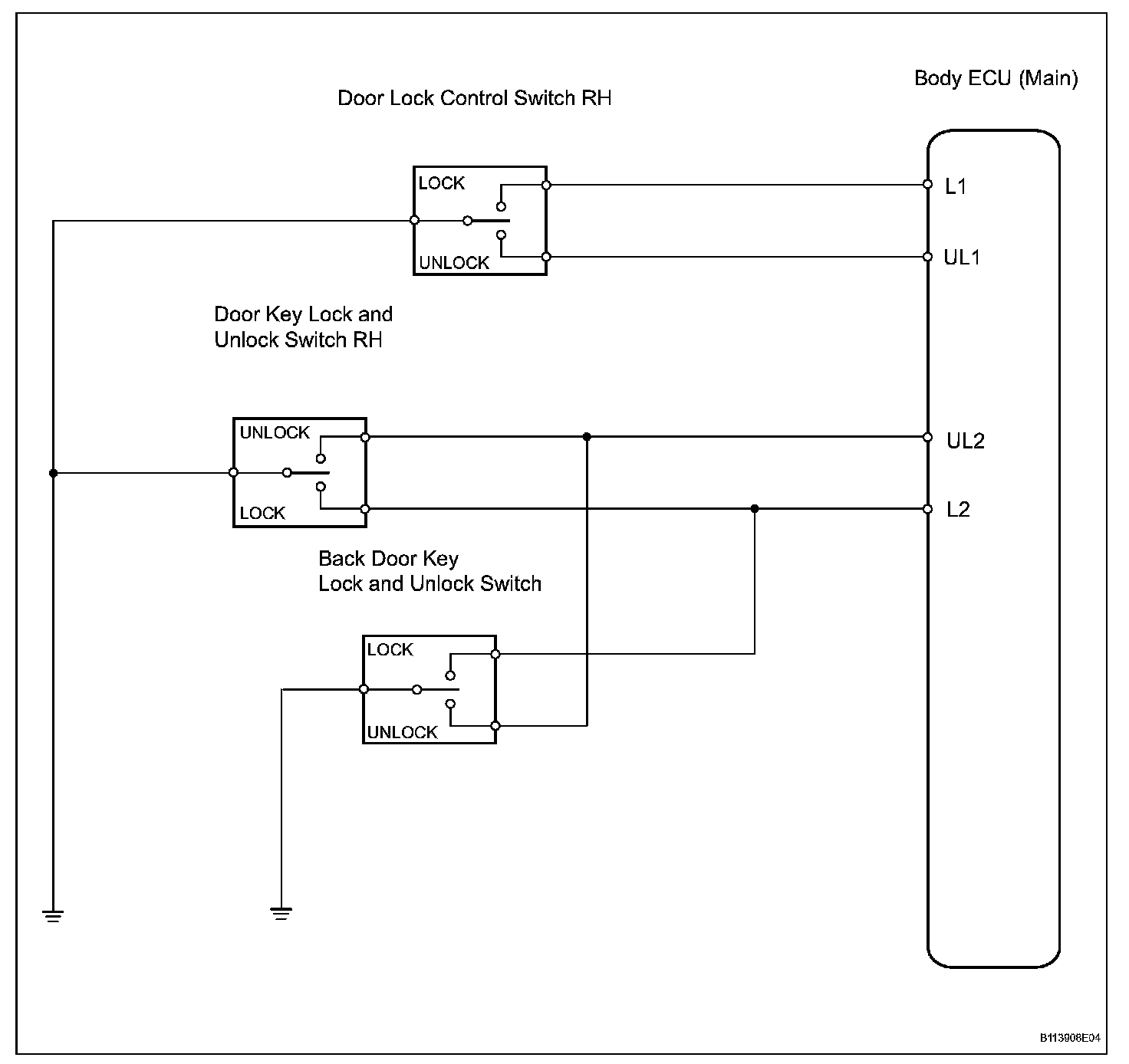 The door key lock and unlock switch is built in the door key cylinder. When the key is turned to the lock side, the LOCK terminal of the switch is grounded and when the key is turned to the unlock side, the UNLOCK terminal of the switch is grounded.