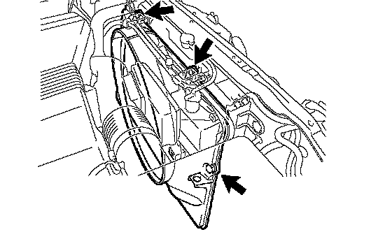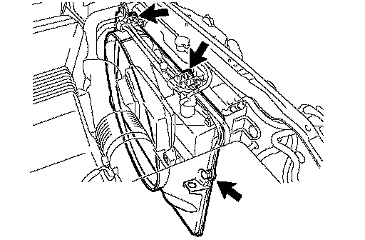 b. Remove the 2 bolts, and disconnect the 2 wire harness brackets from the radiator.