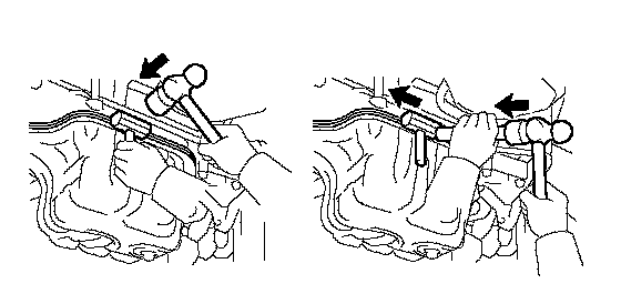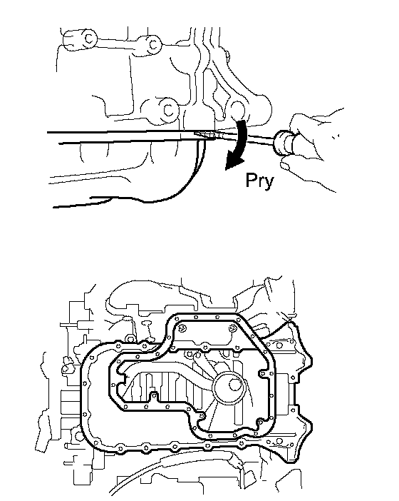b. Using a screwdriver, remove the oil pan by prying the areas between the cylinder block and oil pan shown in the illustration.