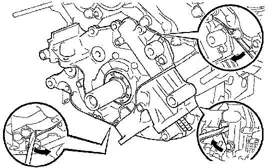 b. Using a screwdriver, remove the oil pump by prying the areas between the oil pump and cylinder block shown in the illustration.